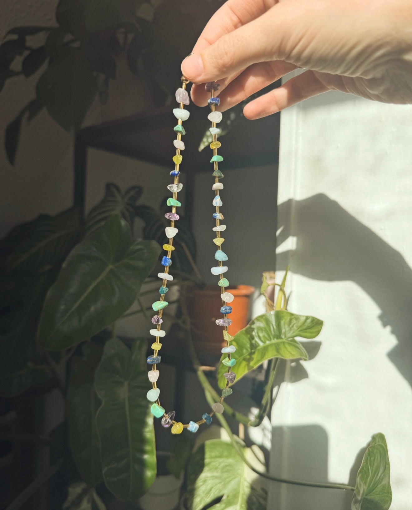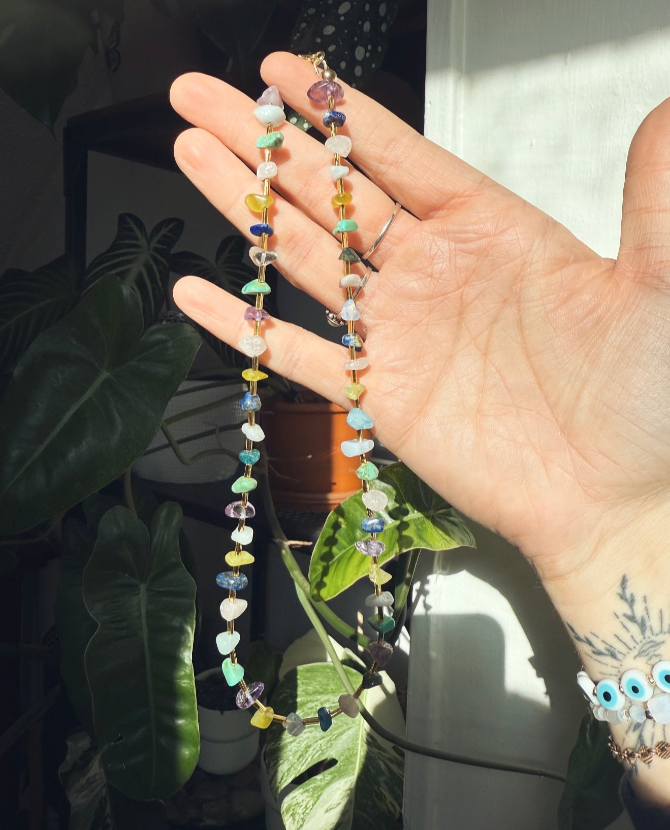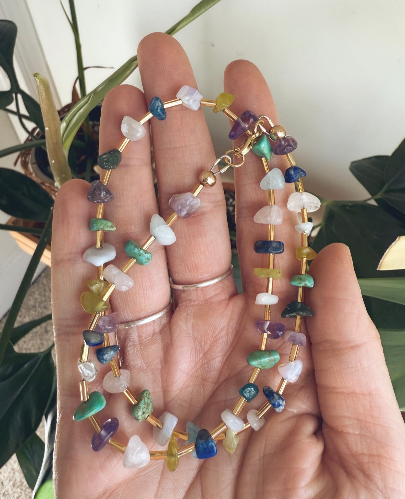 *made from semi precious stones and gold colored beads *stones include amethyst, citrine, lapis lazuli, aventurine, rose quartz, opal, fluorite, tigers eye and turquoise *strung on stainless steel wire *gold plated hardware *17 1/2 inches in length